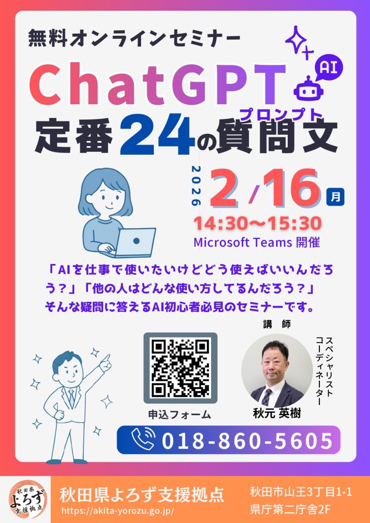 【令和8年2月16日開催】オンラインセミナー相談会「ChatGPT 定番の質問文24選」