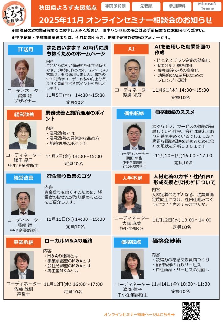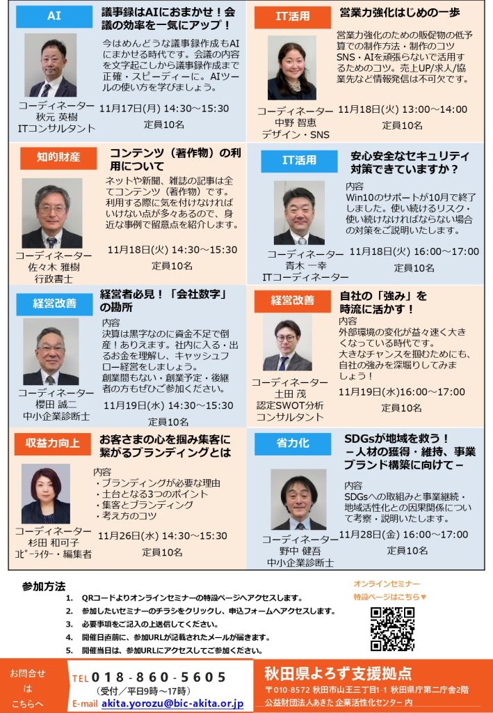 秋田県よろず支援拠点では、毎月様々なテーマで無料オンラインセミナー相談会を開催しております。