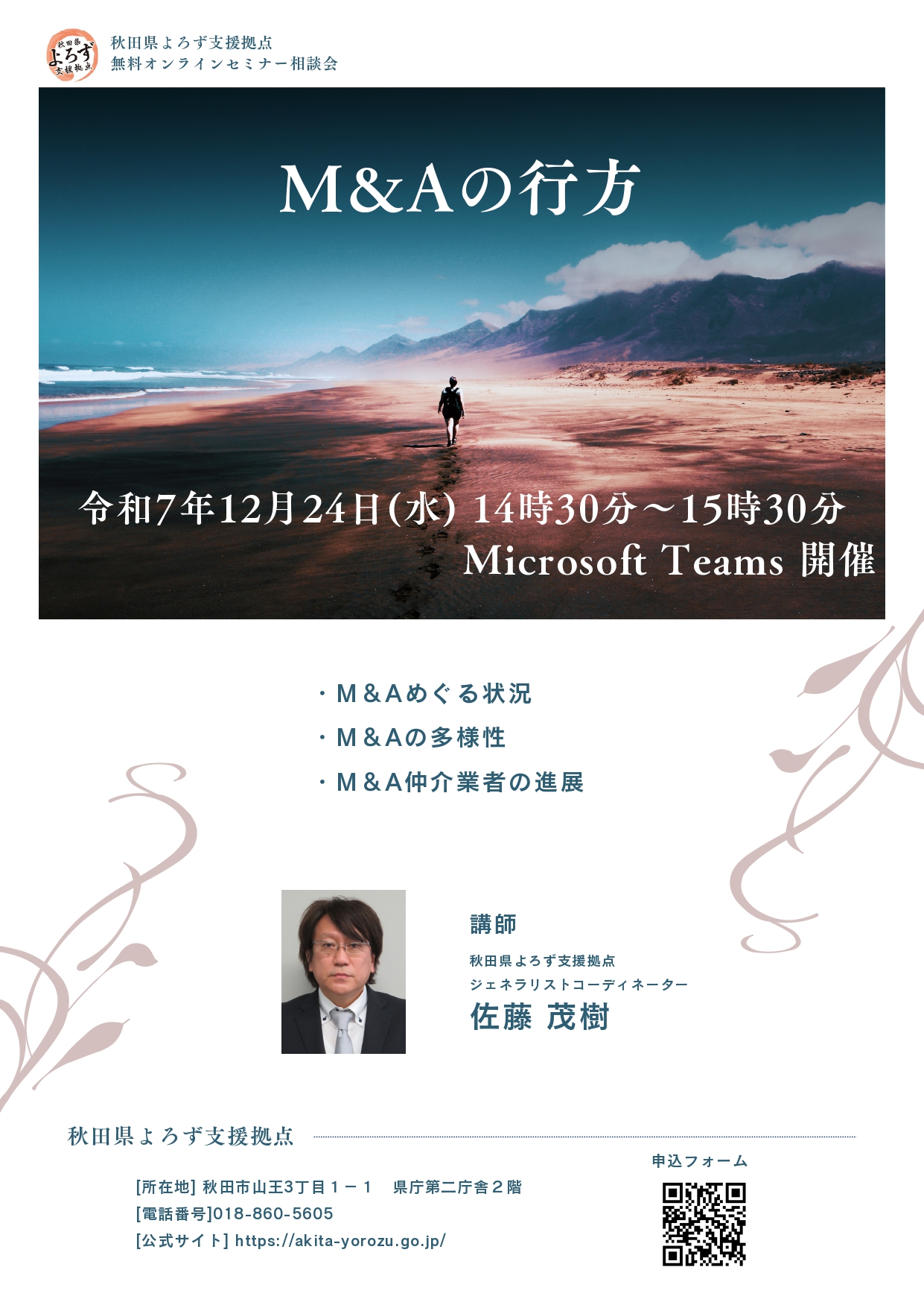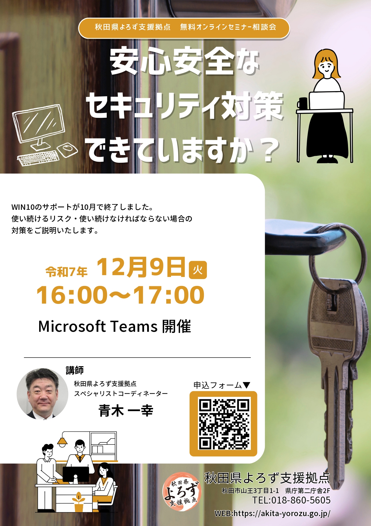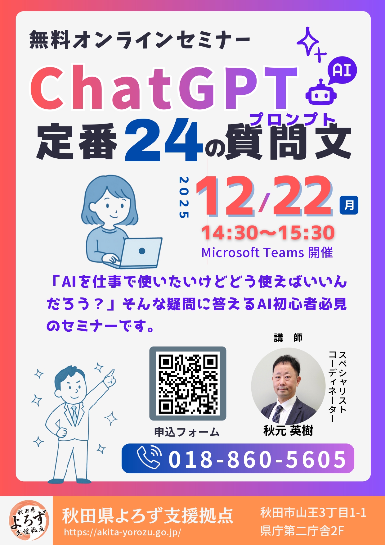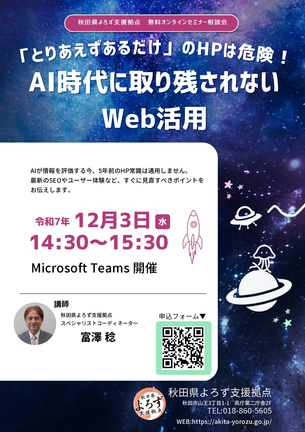2025年11月18日 【令和7年12月26日開催】オンラインセミナー相談会「組織力を高める!!SDGs実践講座」 雇用・労務 募集中 2025年11月18日 【令和7年12月25日開催】オンラインセミナー相談会「資金繰りの見える化と資金不足の対応」 資金繰り 募集中 2025年11月18日 【令和7年12月24日開催】オンラインセミナー相談会「M&Aの行方」 事業承継 募集中 2025年11月18日 【令和7年12月23日開催】オンラインセミナー相談会「AI活用で簡単チラシ制作 ChatGPTで強みを整理」 AI活用 IT利活用 募集中 2025年11月18日 【令和7年12月22日開催】オンラインセミナー相談会「ChatGPT定番の質問文24選」 AI活用 IT利活用 募集中 2025年11月18日 【令和7年12月19日開催】オンラインセミナー相談会「業務効率化と収益改善」 経営改善 募集中 2025年11月18日 【令和7年12月18日開催】オンラインセミナー相談会「付加価値を高めるブランディングと『価格転嫁』」 経営改善 募集中 2025年11月18日 【令和7年12月18日開催】オンラインセミナー相談会「価格転嫁の資料作成、交渉術について」 経営改善 募集中 2025年11月18日 【令和7年12月17日開催】オンラインセミナー相談会「経営者必見!『会社数字』の勘所」 経営改善 資金繰り 募集中 2025年11月18日 【令和7年12月17日開催】オンラインセミナー相談会「価格交渉術」 売上拡大 募集中 2025年11月18日 【令和7年12月12日開催】オンラインセミナー相談会「地域企業の人材確保強化セミナー」 人手不足 雇用・労務 募集中 2025年11月18日 【令和7年12月10日開催】オンラインセミナー相談会「事業承継ことはじめ~歴史に学ぶ編~」 事業承継 募集中 2025年11月18日 【令和7年12月9日開催】オンラインセミナー相談会「安心安全なセキュリティ対策できていますか?」 IT利活用 募集中 2025年11月18日 【令和7年12月9日開催】オンラインセミナー相談会「原価計算の基本知識」 経営改善 募集中 2025年11月18日 【令和7年12月3日開催】オンラインセミナー相談会「『とりあえずあるだけ』のHPは危険! AI時代に取り残されないWeb活用」 AI活用 IT利活用 募集中 2025年11月18日 【令和7年12月1日開催】オンラインセミナー相談会「価格転嫁のススメ」 売上拡大 経営改善 募集中 2025年10月21日 【令和7年11月28日開催】オンラインセミナー相談会「SDGsが地域を救う!-人材の獲得・維持、事業ブランド構築に向けて-」 業務改善・生産性向上 募集中 2025年10月21日 【令和7年11月26日開催】オンラインセミナー相談会「お客さまの心を掴み集客に繋がるブランディングとは」 広報戦略 募集中 2025年10月21日 【令和7年11月19日開催】オンラインセミナー相談会「自社の「強み」を時流に活かす!」 売上拡大 募集中 2025年10月21日 【令和7年11月18日開催】オンラインセミナー相談会「経営者必見!「会社数字」の勘所」 経営改善 募集中 2025年10月21日 【令和7年11月18日開催】オンラインセミナー相談会「安心安全なセキュリティ対策できていますか?」 IT利活用 募集中 2025年10月21日 【令和7年11月18日開催】オンラインセミナー相談会「コンテンツ(著作物)の利用について」 知財活用 募集中 2025年10月21日 【令和7年11月18日開催】オンラインセミナー相談会「営業力強化はじめの一歩」 AI活用 IT利活用 募集中 2025年10月21日 【令和7年11月17日開催】オンラインセミナー相談会「議事録はAIにおまかせ!会議の効率を一気にアップ!」 AI活用 IT利活用 募集中 2025年10月21日 【令和7年11月14日開催】オンラインセミナー相談会「価格交渉術」 売上拡大 募集中 2025年10月21日 【令和7年11月12日開催】オンラインセミナー相談会「ローカルM&Aの活路」 事業承継 募集中 2025年10月21日 【令和7年11月12日開催】オンラインセミナー相談会「人材定着のカギ!社内キャリア形成支援とリスキリングについて」 人手不足 募集中 2025年10月21日 【令和7年11月11日開催】オンラインセミナー相談会「資金繰り改善のコツ」 経営改善 資金繰り 募集中 2025年10月21日 【令和7年11月10日開催】オンラインセミナー相談会「価格転嫁のススメ」 売上拡大 経営改善 募集中 2025年10月21日 【令和7年11月7日開催】オンラインセミナー相談会「業務改善と施策活用のポイント」 経営改善 補助金活用 募集中 1 / 912345...»最後 »